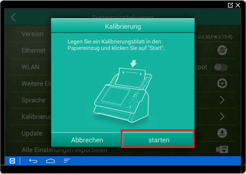 Legen Sie anschließend das Kalibrierungsblatt ein. Dies wurde bei der Auslieferung des Gerätes beigelegt. Starten Sie den Vorgang mit "starten".