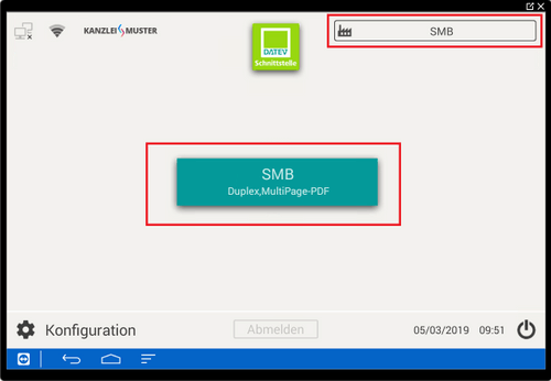 Kehren Sie auf den Startbildschirm zurück. Sie können nun unter der Firmenauswahl Ihr eben konfiguriertes SMB Ziel auswählen.