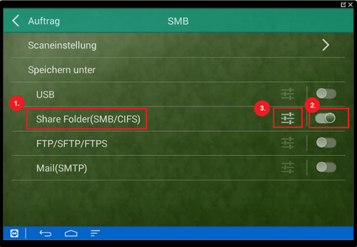 Aktivieren Sie den SMB Zugang mit dem Schiebeschalter und wählen Sie die Einstellungen (3).