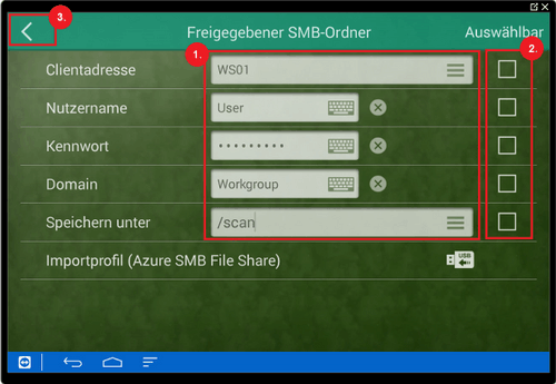 Definieren Sie Ihre SMB Einstellungen. Die Haken unter (2) können Sie deaktivieren. Diese Funktion würde bei jedem SCAN-Vorgang diese Einstellungen erneut zur Eingabe bringen. Klicken Sie nach erfolgreicher, vollständiger Eingabe aller Angaben auf "zurück" (3).