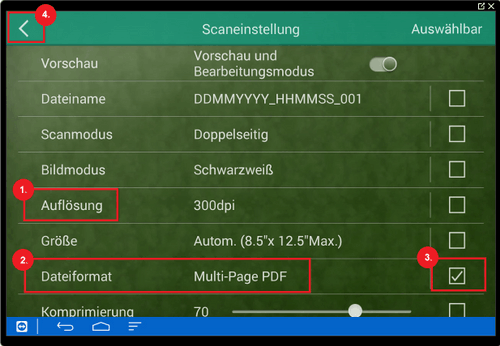 Definieren Sie hier Ihre Scaneinstellungen nach Ihren Wünschen. Sie können wie im Beispiel gezeigt unter (3) auch eine Option zur Auswahl beim Scanvorgang markieren.